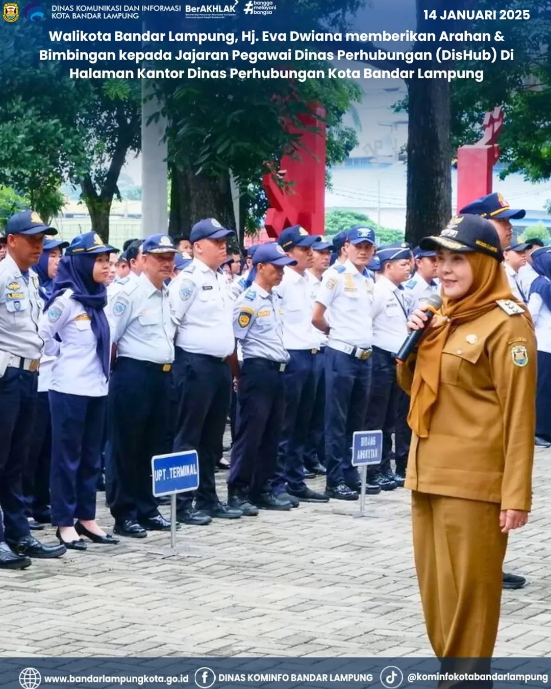 Walikota Bandar Lampung, Hj. Eva Dwiana memberikan arahan & bimbingan kepada Jajaran Pegawai Dinas Perhubungan (DisHub) Di Halaman Kantor Dinas Perhubungan Kota Bandar Lampung. Selasa (14/01/2025).