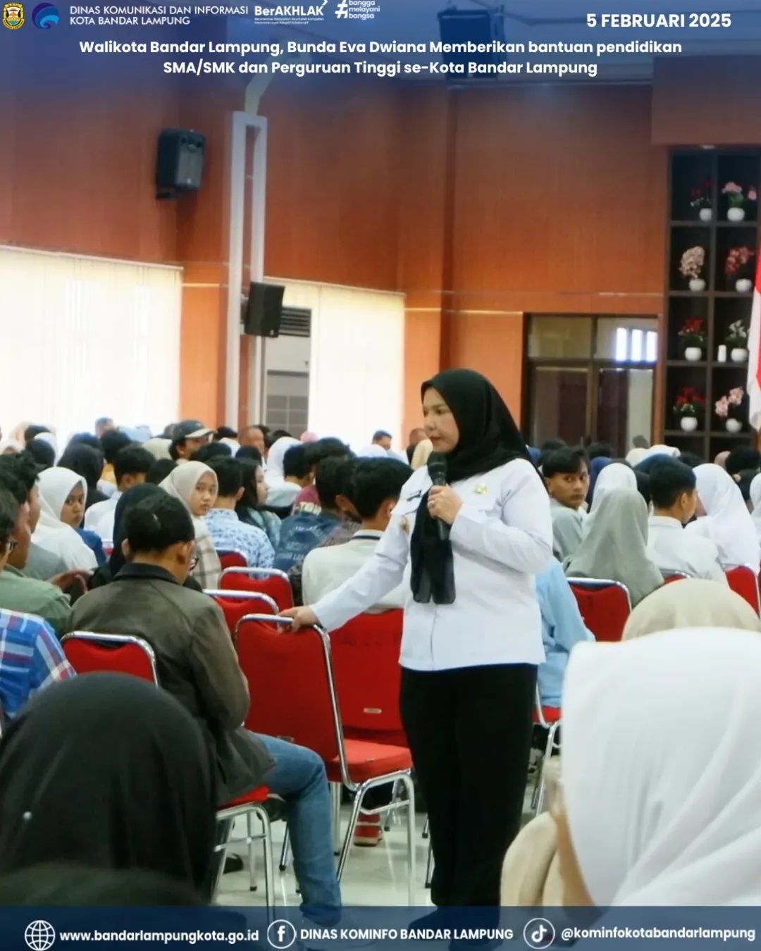 Walikota Bandar Lampung, Hj. Eva Dwiana Memberikan bantuan pendidikan SMA/SMK dan Perguruan Tinggi Negeri se-Kota Bandar Lampung.