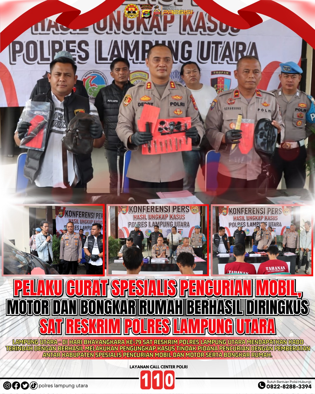 Lampung Utara – Di hari Bhayangkara Ke-79 Sat Reskrim Polres Lampung Utara mendapatkan kado terindah dengan berhasil melakukan pengungkap kasus Tindak Pidana Pencurian dengan Pemberatan antar Kabupaten Spesialis Pencurian Mobil dan Motor serta Bongkar Rumah.